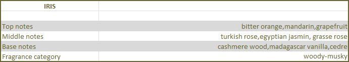 This fragrance is Iris’s multicolour secret, with notes of classic red rose, yellow citrus fruits, and white Egyptian jasmine. Madagascar vanilla completes Iris’s colours, capturing the complexity and beauty of life.